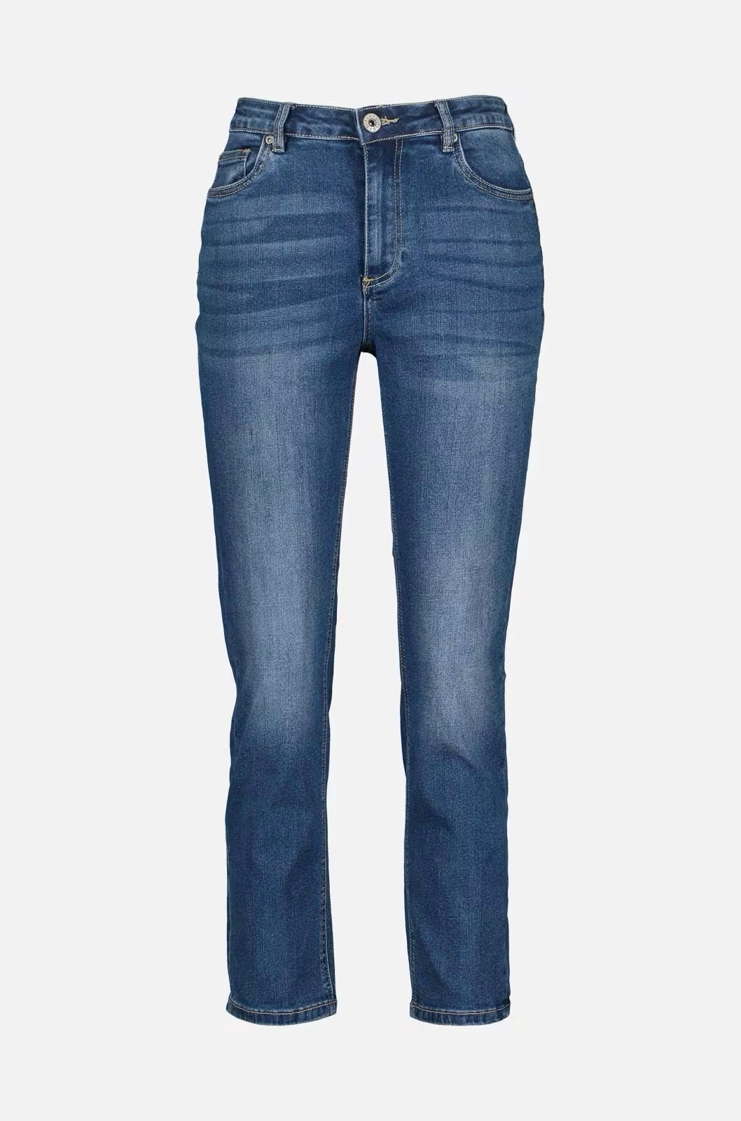 Jeans med høyt liv og 5-lomme design. Lukkes med fire knapper og glidelås. Buksen har en smal passform med god stretch.