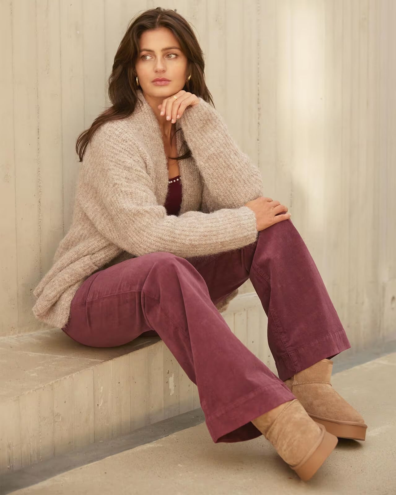 Bukse i myk kordfløyel og en superfin grønnfarge. Den har høyt liv og utvendige lommer foran for en trendy look. Baklommene er plassert midt på rumpa for en flatterende passform. Den har sleng med dekorativ søm nederst på beina. Buksen er i bomull med en myk kordfløyel overflate, og har god stretch.
