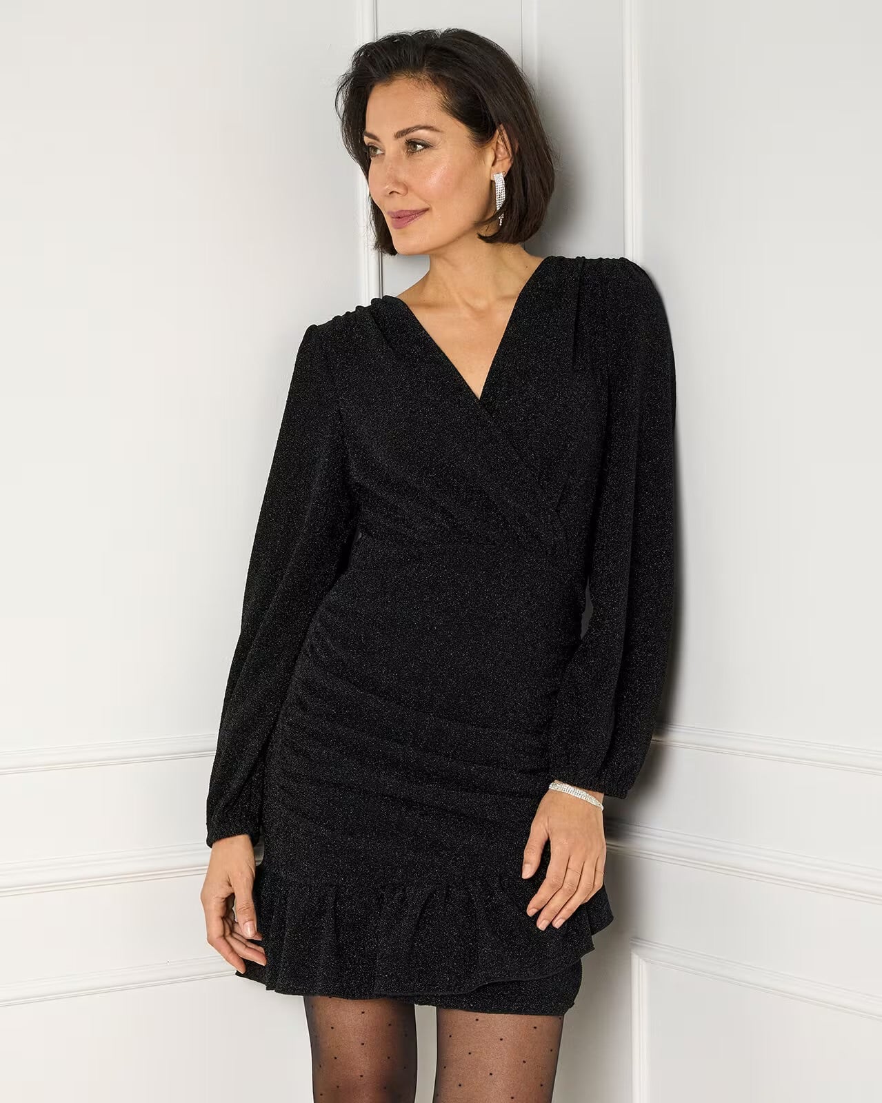 Kort kjole med en svart bunn og svarte, metalliske tråder som gir den et glitrende utseende. Den perfekte festkjolen til deg som ønsker en klassisk look med det lille ekstra!