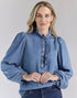 Lekker bluse i 100% myk tencel med denim look. Den har høy krage med rysjer. Blusen har lange ballongermer med puff på skuldrene og tynn strikk nederst. Den har en rett passform uten stretch.