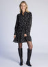 Denne svarte kjolen med hvitt småblomstret print kombinerer klassisk eleganse med romantiske detaljer. Kjolen er laget i tynn chiffon med en lett kreppet struktur, som gir et luftig og raffinert uttrykk. Den har en dekorativ rysjekant i halsen og knapper foran på overdelen som gir en feminin touch. Midjen er markert med strikk i ryggen for en flatterende passform, mens skjørtet faller mykt og gir god bevegelse. Ermene er lange og avsluttes med mansjetter med fire tekstiltrukne knapper – en diskret og eksklusiv detalj. Kjolen er tynt fòret for komfort og dekkevne, uten at den mister det lette uttrykket.