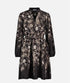 Feminin kjole i blank sateng med print på svart bunn. Den har V-hals med liten ståkrage og knappestolpe ned til livet som gir et elegant uttrykk. Midjen markeres med en tynn strikk som fremhever fasongen uten å stramme. De lange ermene avsluttes med smale, elastiske mansjetter for en lett og behagelig passform. Praktiske stikklommer i sidene gjør kjolen både chic og anvendelig.