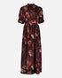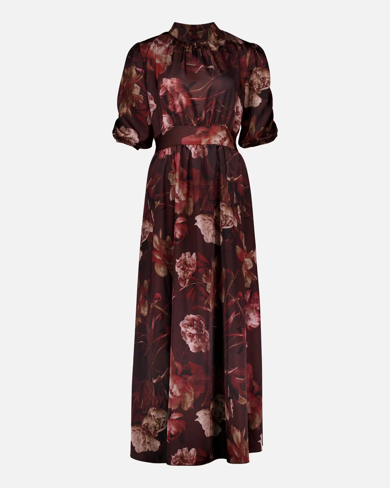 En nydelig maxikjole i sateng med et elegant blomsterprint som kombinerer romantiske detaljer med et moderne uttrykk. Den har høy hals og korte puffede ermer med rynkedetaljer som gir et feminint preg.